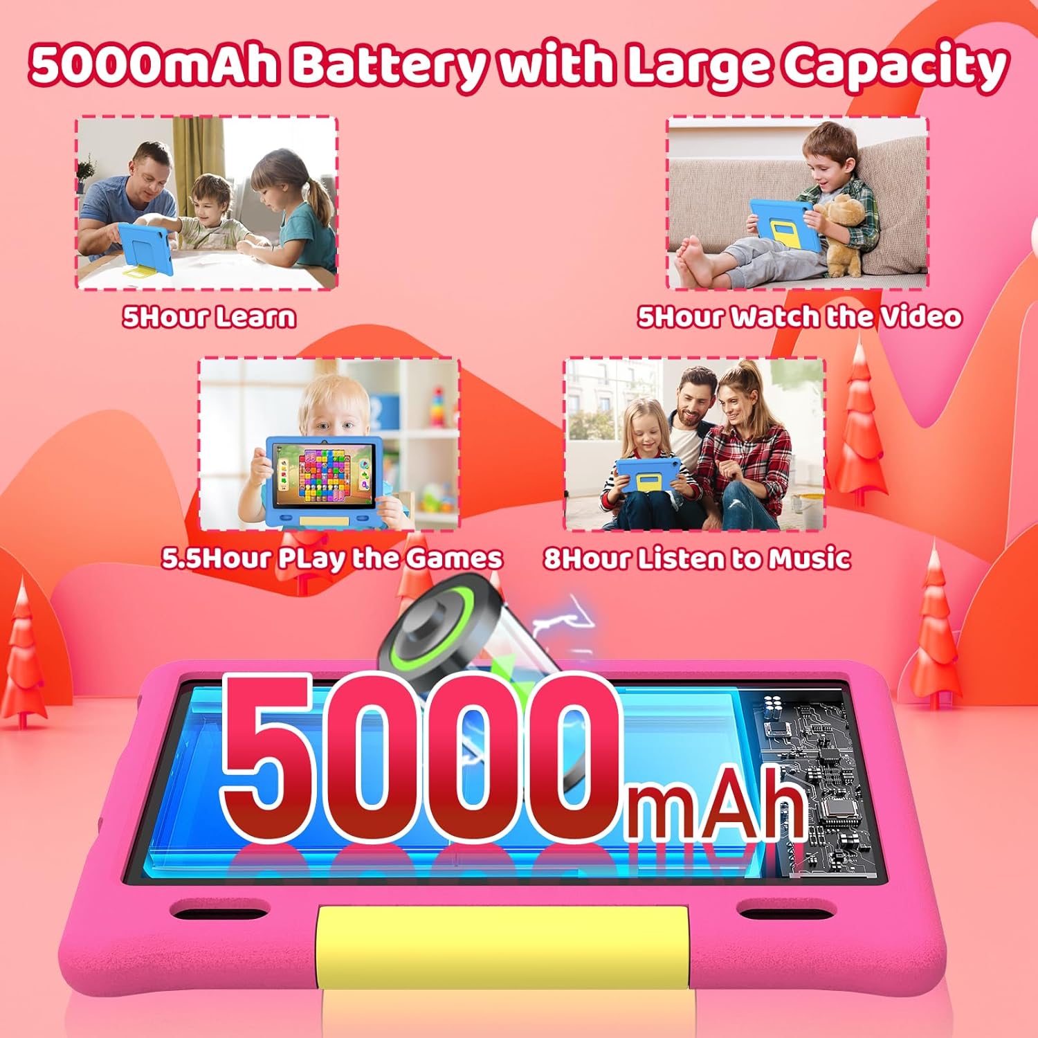 【5000mAh Durable Battery & Type-C Fast Charging】The android 15 tablet for kids is designed for beginners and gamers, equipped with a durable 5000mAh polymer lithium battery that can be used continuously for up to 6 hours (for streaming, educational applications, drawing, or gaming). The android 15 tablet is equipped with a USB Type-C port for fast and convenient charging, ensuring that the tablet always provides power for the child’s next activity without waiting any longer.