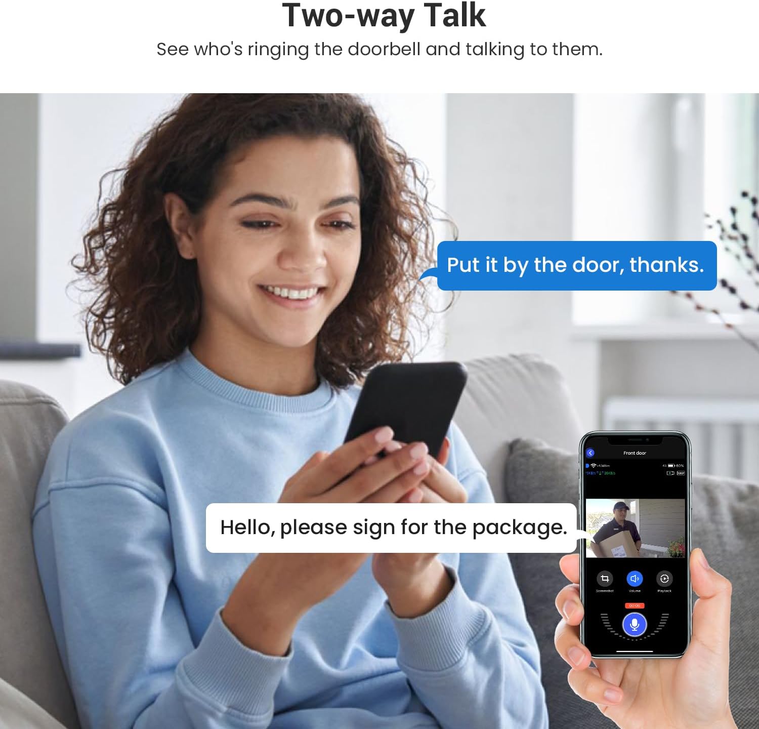 Two-Way Audio, Anytime, Anywhere: Talk to visitors and handle deliveries remotely with instant two-way communication.