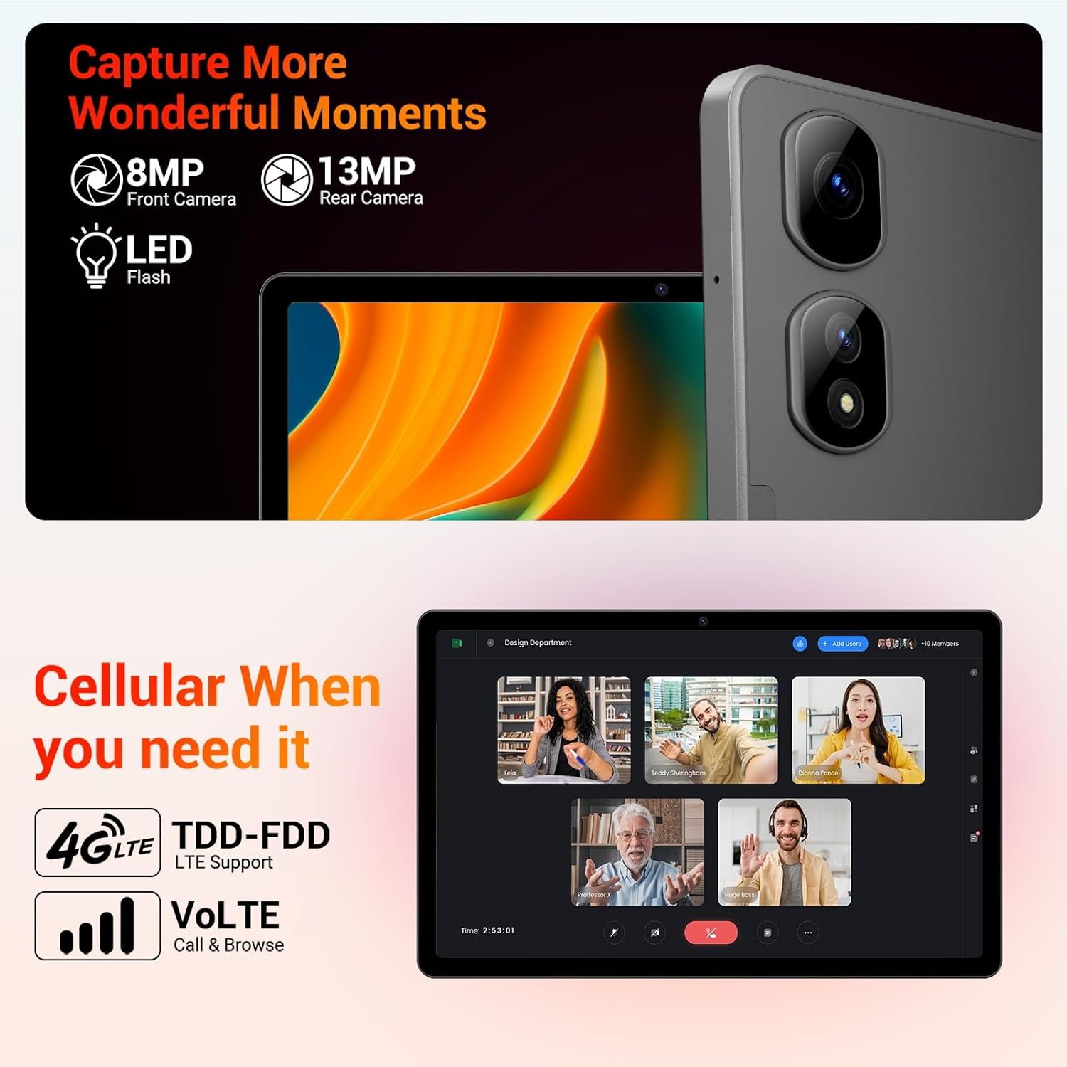 🌐【9580mAh +13MP/8MP + LTE/WiFi All-Round Connectivity】Stay charged all day with a 9580mAh battery. Capture crisp shots/videos via 13MP rear + 8MP front cameras (great for video calls). It also supports dual 4G LTE SIMs and dual-band Wi-Fi (2.4GHz/5GHz) for fast, reliable connectivity anywhere.