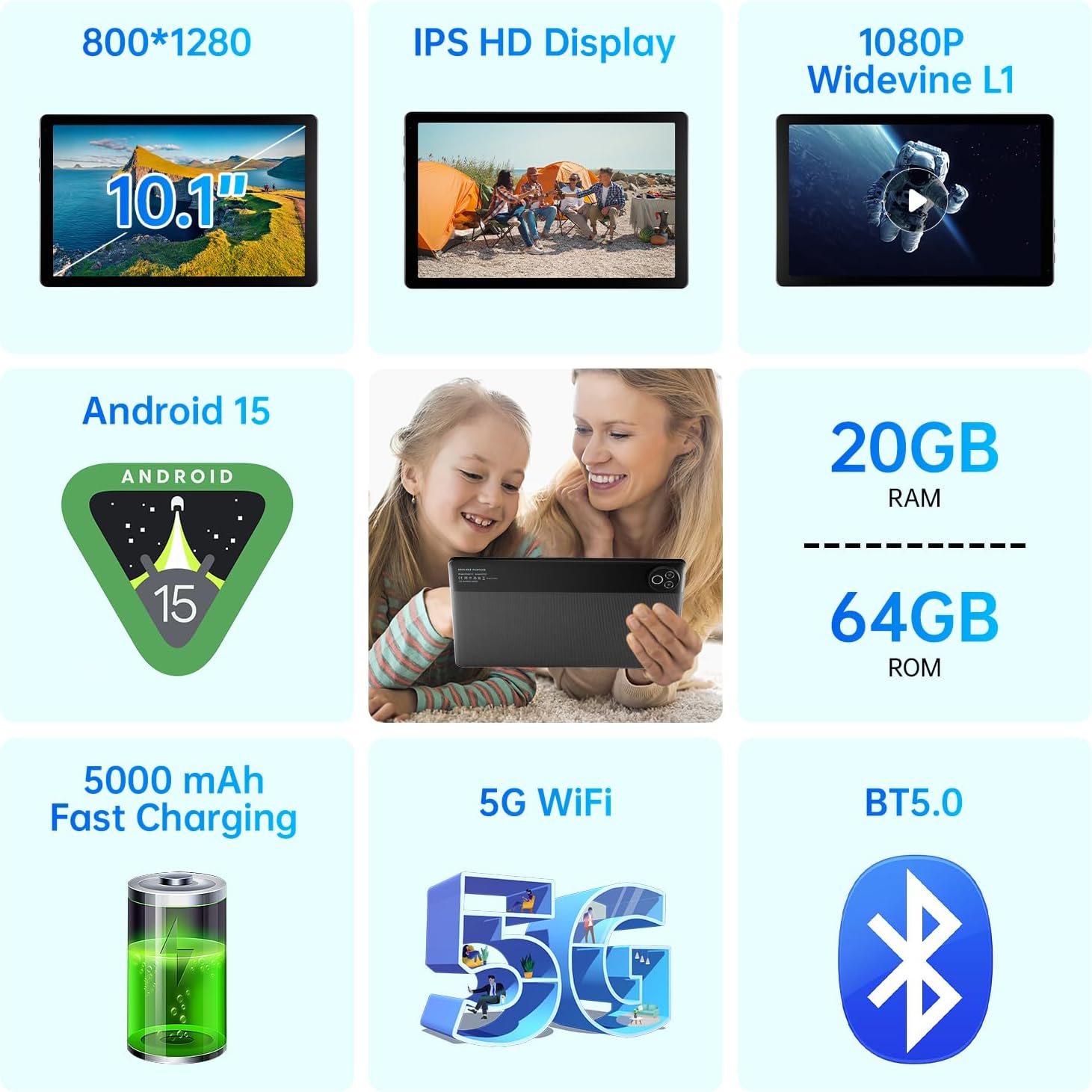 Android 15 Tablet, 2025 Newest 10 Inch Tablet, 20GB RAM+64GB ROM (TF 1TB), 5000mAh, 1280 * 800 HD, WiFi 6, Bluetooth 5.4, Dual Cameras, Dual Speakers, Black