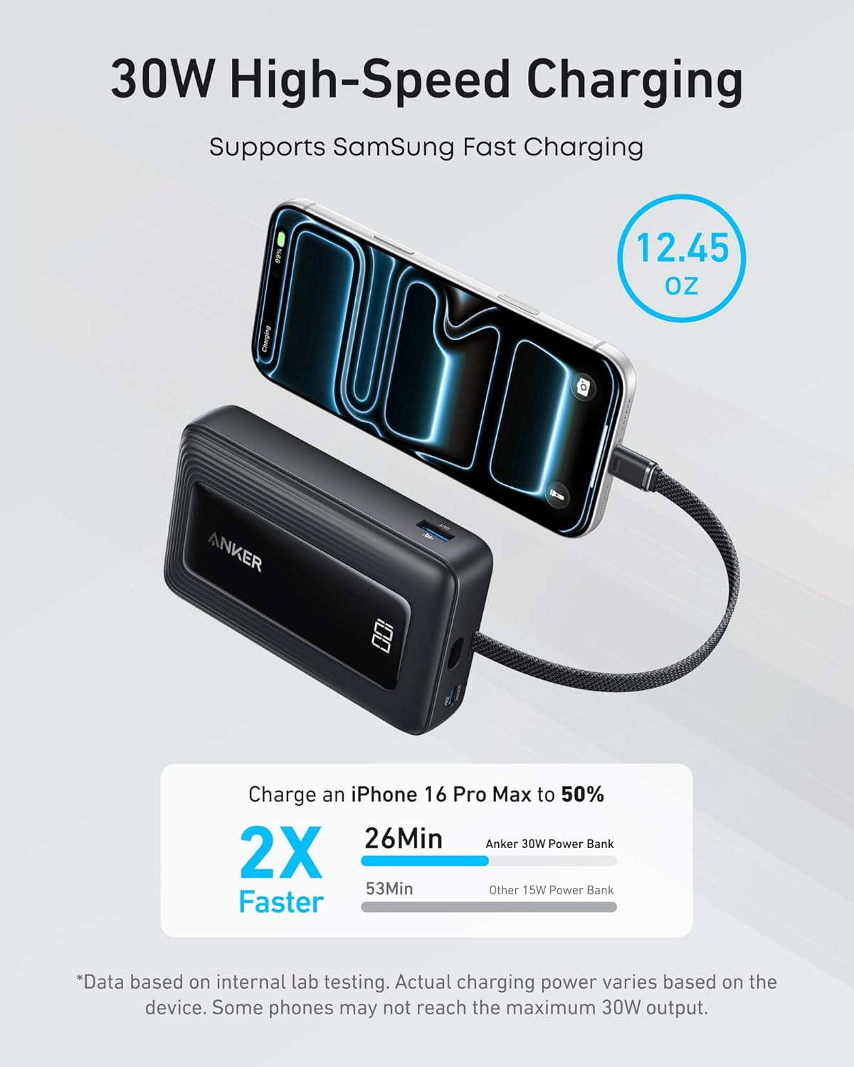 30W Two-Way Fast Charging: Charge quickly with 30W output and recharge just as fast with 20W input, keeping your devices ready in no time. Boost an iPhone 15 from 0 to 57% in just 30 minutes.