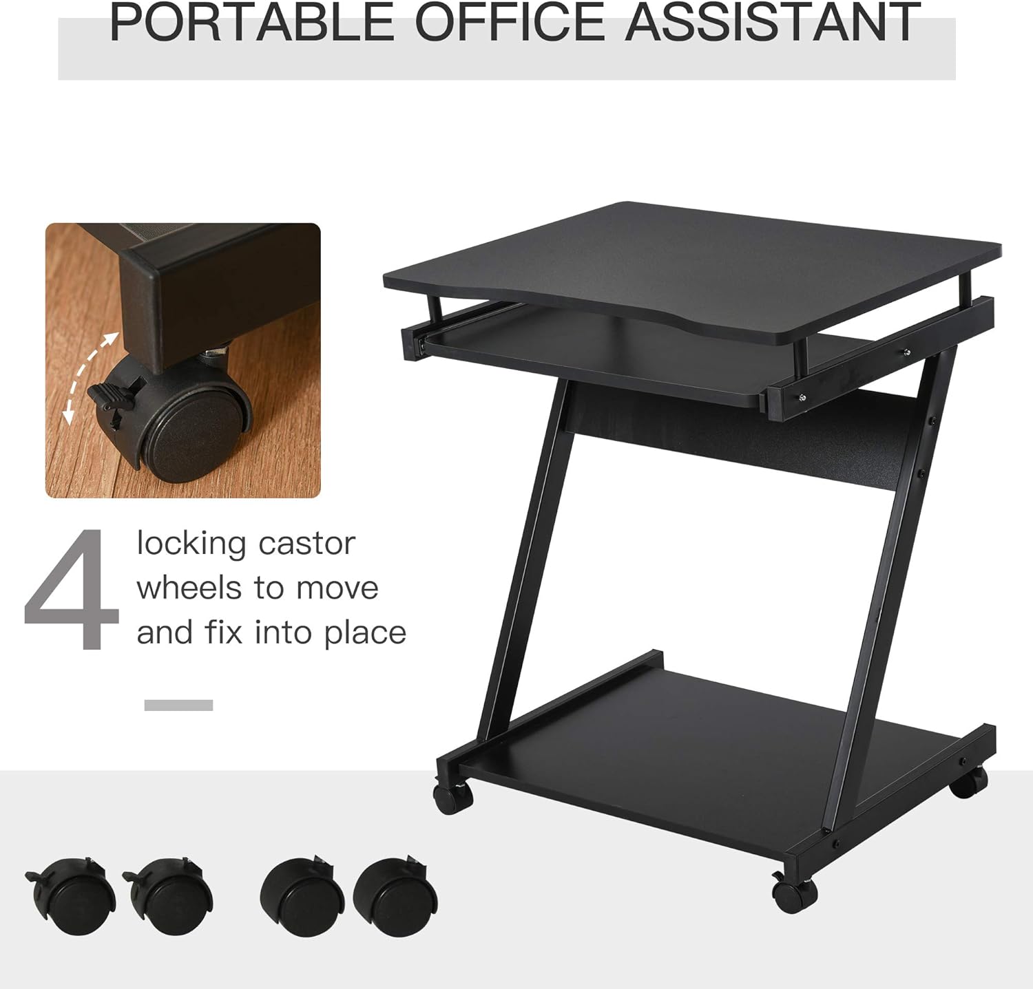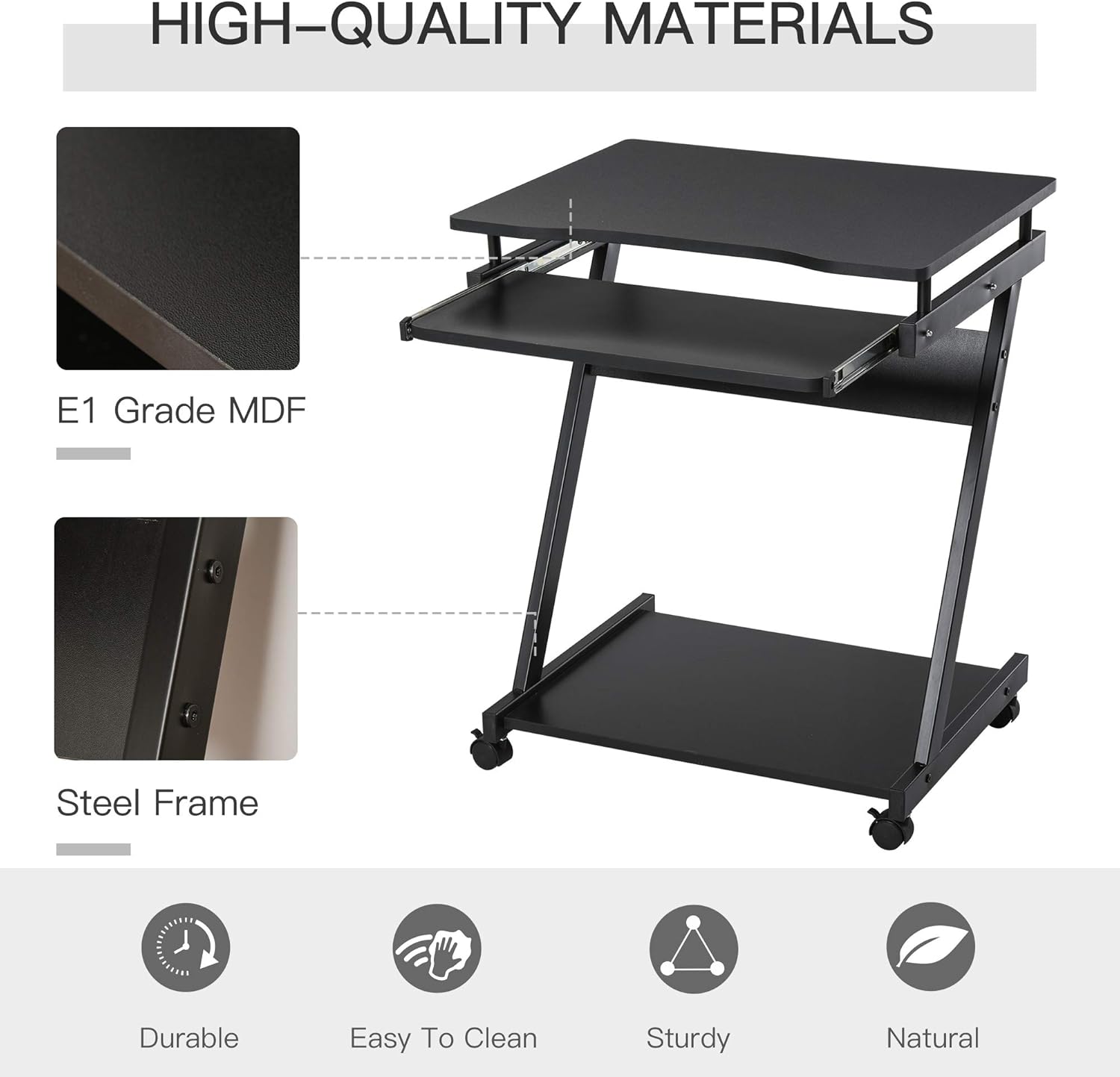 METAL FRAME: Ensures a solid foundation for reliable everyday use. Formed into a ‘z’shaped design which helps aid balance and stability. PARTICLE BOARD SHELVES: A flat surface to work from, smooth and easy to clean.
