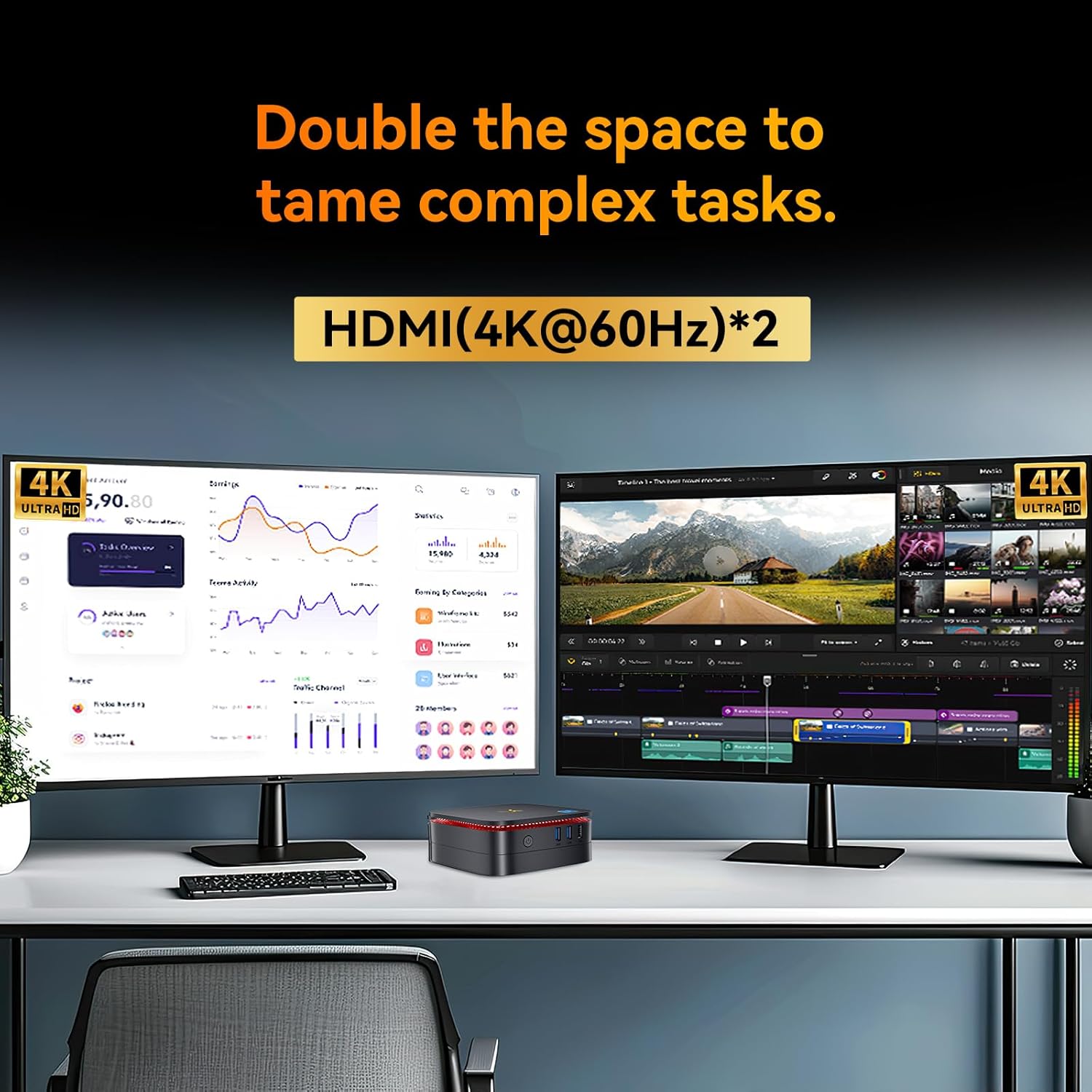 【Dual 4K@60Hz】The small pc supports 4K Ultra HD output (maximum resolution of 4096×2160@60Hz) the common standard for digital cinema, and the high-frequency dynamic graphics card (1000MHz) guarantees a smooth picture, giving you a visual Ultra HD experience. It is also equipped with dual HDMI 1.4 ports*2 (60Hz) for dual-screen synchronised display, enabling you to multi-task simultaneously and increase efficiency. It can greatly satisfy your business office, design and other need for multi-window collaboration scenarios. The core graphics card with tiny process is able to handle graphic tasks efficiently with low power consumption.