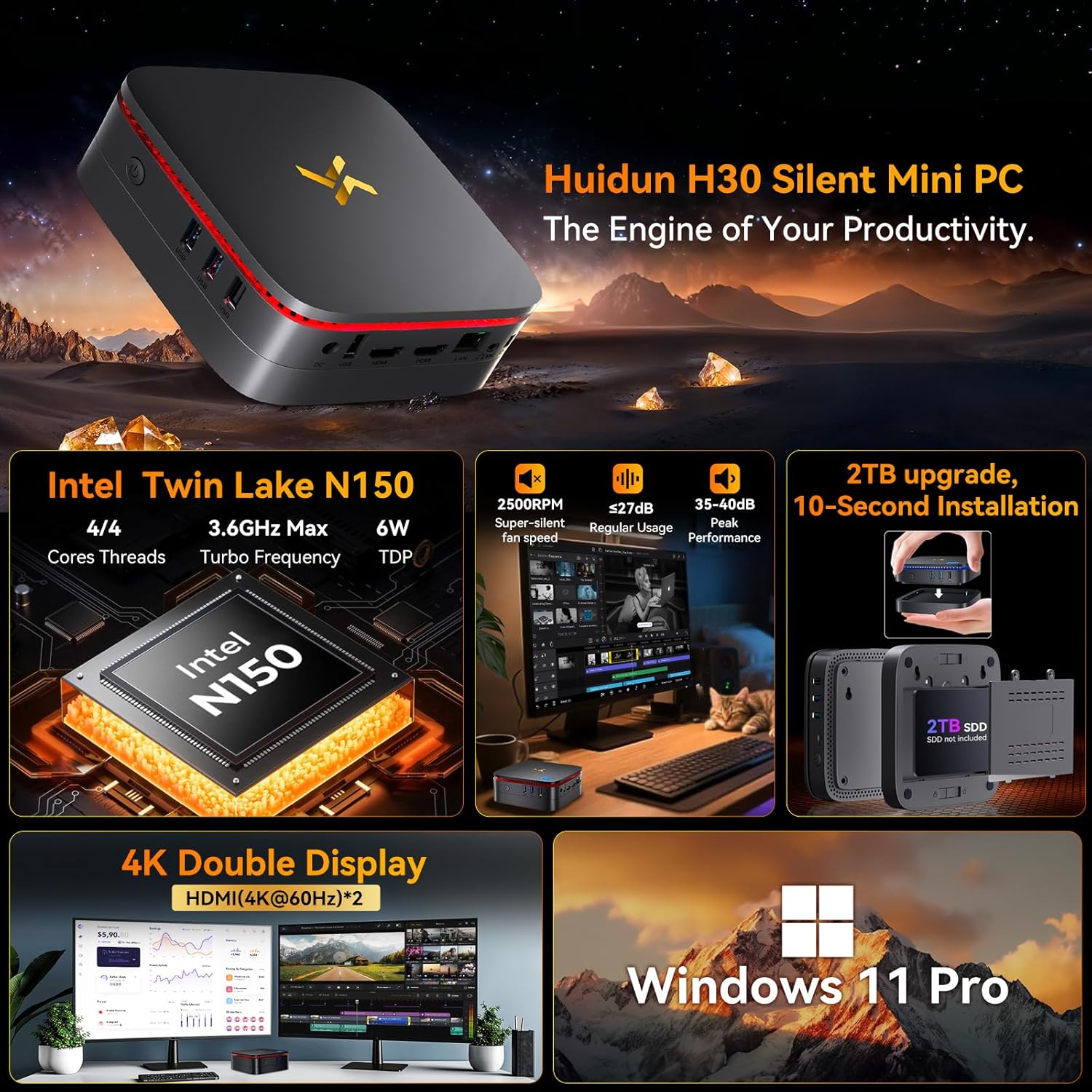 Huidun [3 Years Warrant] H30 Silent Mini PC Intel Twin Lake N150 (Beat N95/3300U), Win 11 pro Micro PC 16GB 512GB SSD, Mini Desktop Computers Support 2 * 4K@60Hz HDMI, USB3.2, VESA Mount for Office