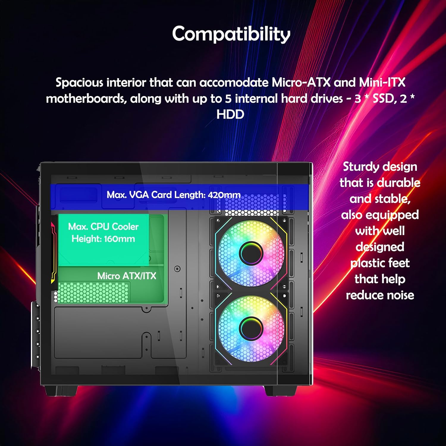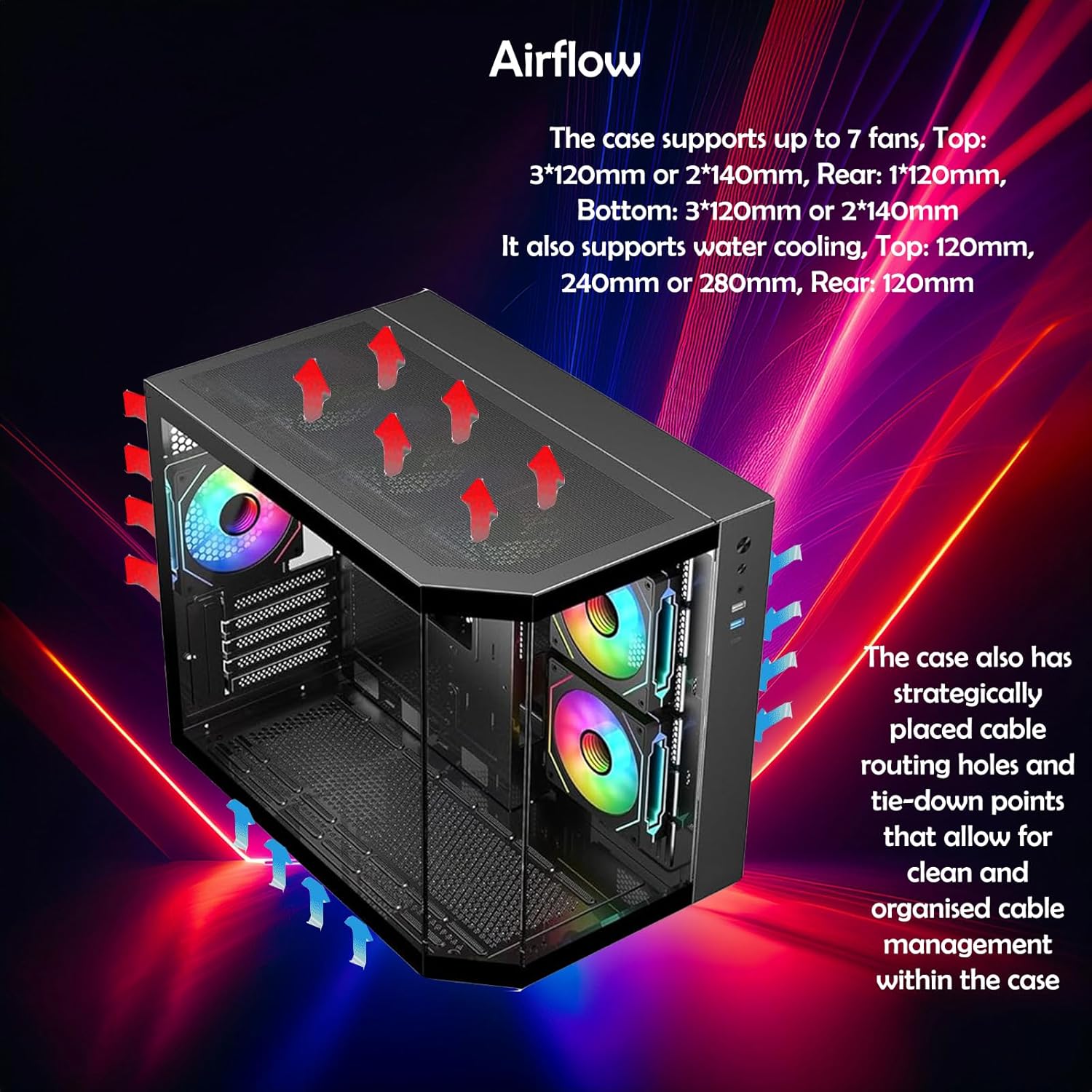 IONZ Apex Black Mid-Tower Case: A dual-chamber design that separates the heat zones for improved airflow and thermal performance, equipped with a tempered glass side panel to showcase your build, six pre-installed ARGB PWM fans for vibrant lighting and effective cooling, and front-panel USB-C for next-gen connectivity; supports Micro-ATX and Mini-ITX motherboards, multiple storage drives, and radiators up to 360 mm—perfectly blending aesthetic appeal, cooling capability, and build flexibility in a sleek black chassis.