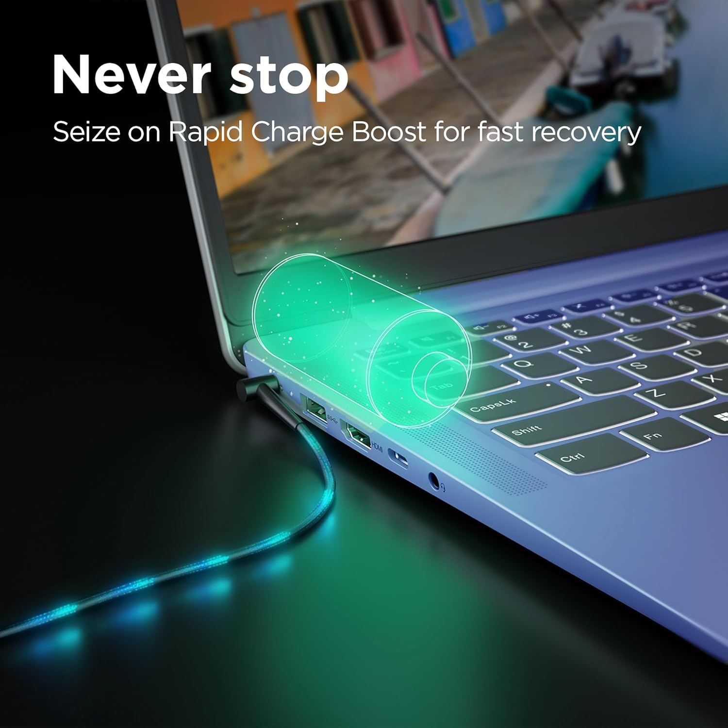 No waiting required – With its rapid-charging technology, the laptop delivers 2 hours of use on a 14-minute charge.