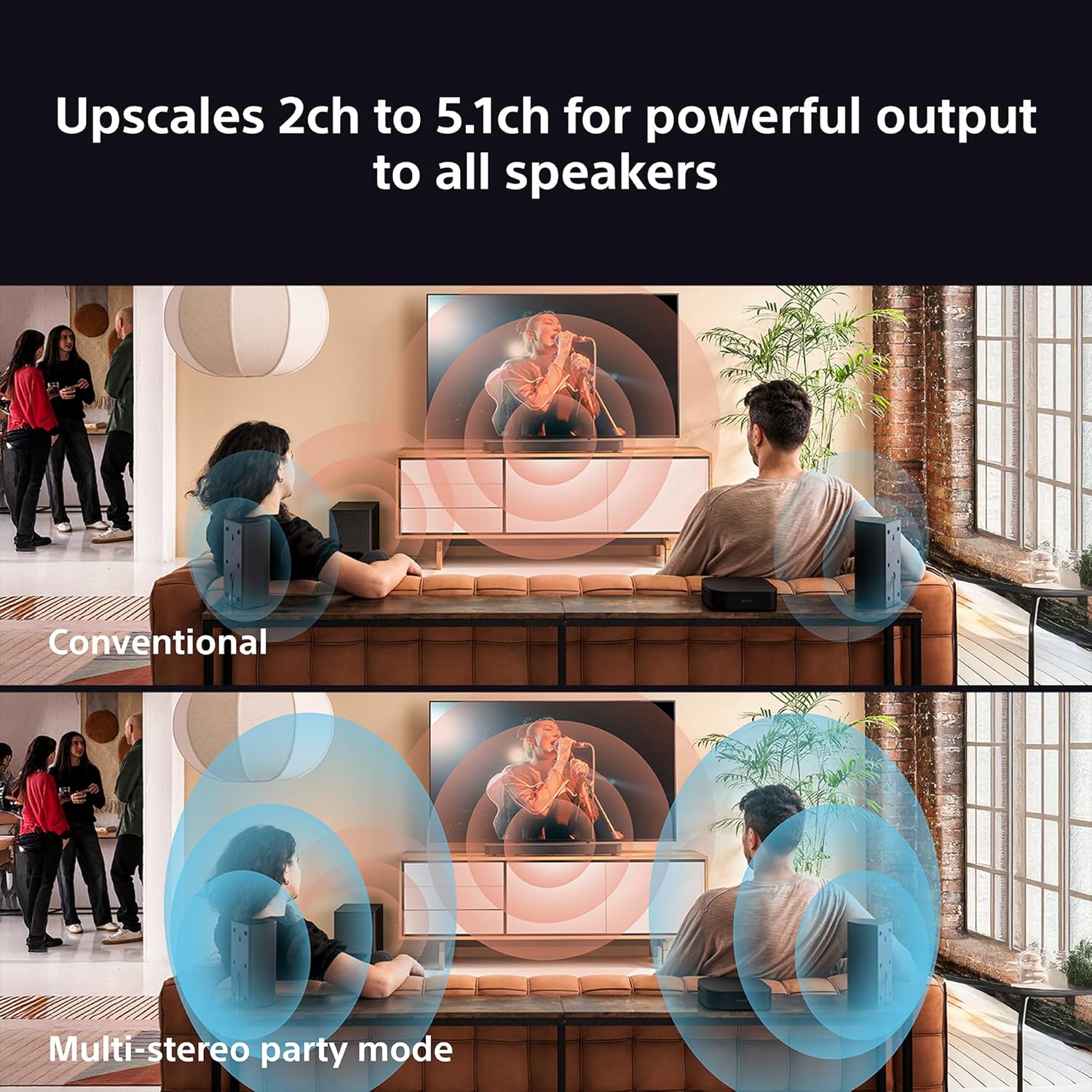 START A PARTY: Multi Stereo Party Mode ensures equal output on all speakers. So even when dancing to 2 channel stereo tracks, you can enjoy the BRAVIA Theatre System 6’s full room-shaking power.